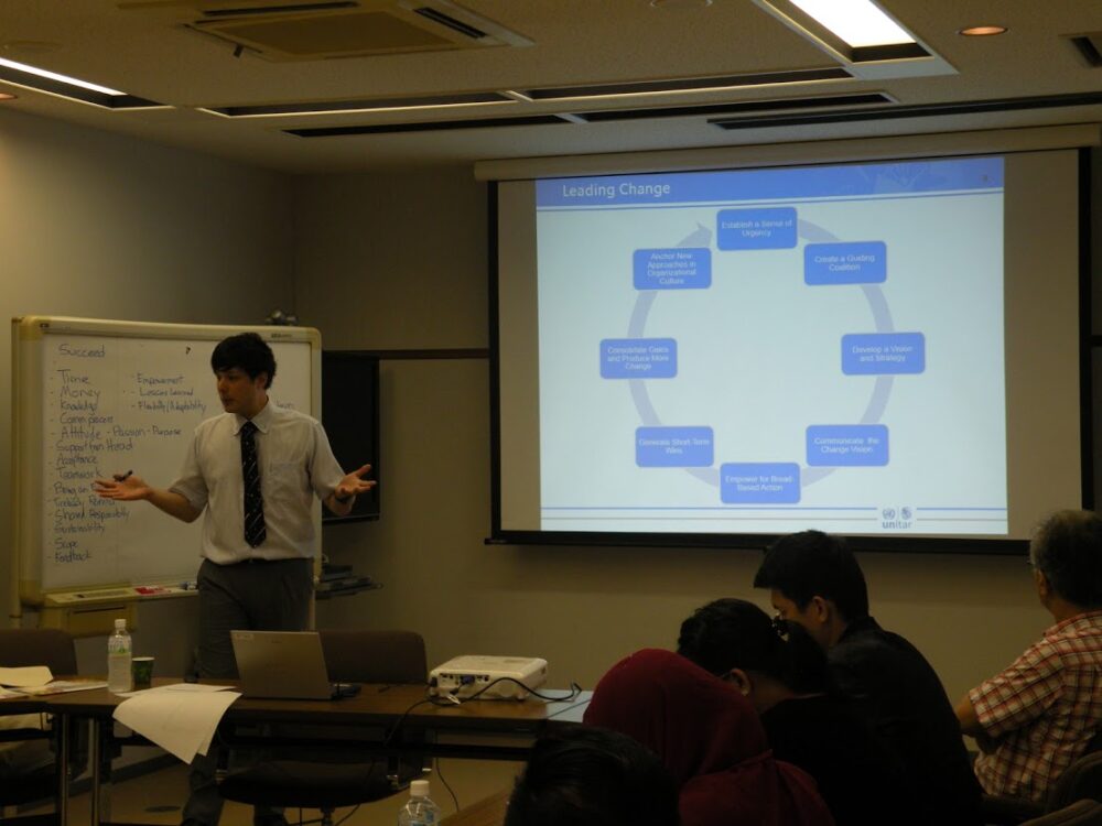 The lecture “Leading Change” was given by Mr. Nigel Gan, Training Associate, UNITAR Hiroshima Office. Mr. Gan showed steps and strategies for successful process of leading change and stages of transition by exploring a changing model and using various practical exercises. Importance of a good communication was also discussed.