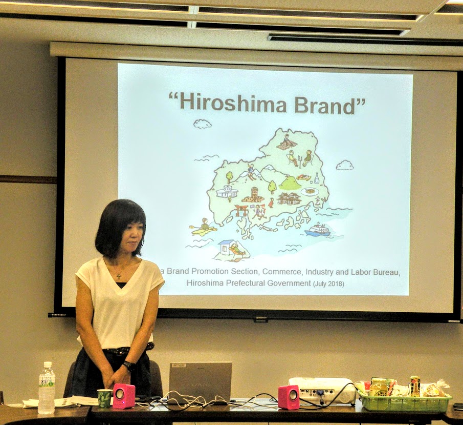 Today’s lecture was both contributed by Hiroshima prefectural Government (HPG). In the morning, the lecture, “Brand Promotion Policy of Hiroshima Prefecture” was given by Ms. Kayo Shimomura, Hiroshima Brand Promotion Division, HPG. Her lecture consisted of two parts: 1) Hiroshima Brand and 2) TAU, Setouchi Hiroshima.