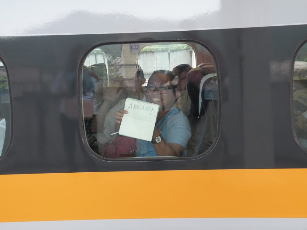 - From the Shinkansen’s window, Nash showing the word for “thank you” in Japanese (ARIGATO)