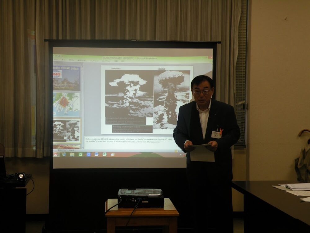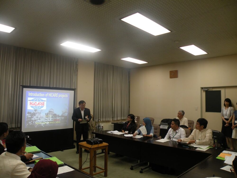 The lecture on HICARE (Hiroshima International Council for the Radiation-exposed) project was originally planned in the afternoon, offered by Mr. Takeshi Yahata, Atomic Bomb Survivors Support Division, HPG. We greatly appreciated Mr. Yahata to kindly re-schedule it to the morning time. It was fortunate that the courtesy call on Governor was held as planned. However, it was unfortunate that we had to cancel other programs such as visiting Hiroshima Prefectural Peace Project Team and the Hiroshima Prefectural Assembly.